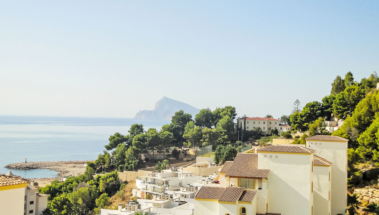 Pueblo Mascarat: Beautiful apartment block "Altea Dorada", 4 storeys. 7 km from the centre of Altea, 5.5 km from the centre of Altea la Vella, 4 km from the centre of Calpe, in an elevated position on a slope, 700 m from the sea. For shared use: garden with lawn, swimming pool (25 x 15 m, seasonal availability: 01.Jan. - 31.Dec.). Children's pool, outdoor shower. In the house: lift. Grocery, restaurant, bar 800 m, bus stop 4.7 km, shingle beach, swimming bay 700 m. Nearby attractions: Aqualandia, Mundomar, Terra Mítica, Terra Natura, y Benidorm Palace (Benidorm). Please note: Additional accommodations can be booked. Harbour 800 m. This block has acces to the swimming pool by a lift or by stairs, so you are at the lowest level below the block.