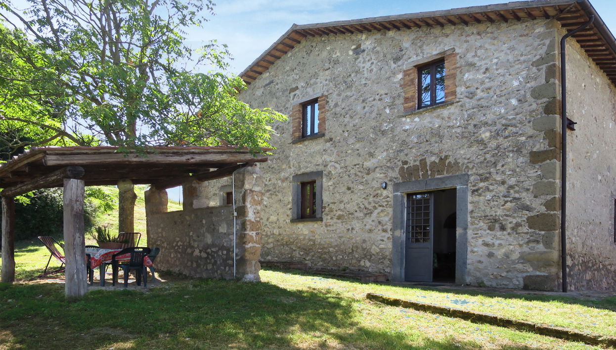 Rustic, simple working farm "Sociano", surrounded by trees, meadows and fields. 4 apartments in the property. 11 km from the centre of Bagnoregio, in a secluded position on top of a hill, 18 km from the lake, in the countryside. For shared use: natural state property 10'000 m2 with meadow, swimming pool (10 x 5 m, depth 80 - 180 cm, seasonal availability: 30.May. - 19.Sep.). WC in the pool area, outdoor shower, barbecue. In the house: lounge with TV, WiFi, billiard table, table football, washing machine (for shared use). 1.5 km long motor access (via unmade road). Parking on the premises. Shop 11 km, grocery 11 km, supermarket 11 km, bus stop 5 km, bathing lake "Lago di Bolsena" 18 km. Nearby attractions: Civita di Bagnoregio 7 km, Bolsena 16 km, Montefiascone 18 km, Orvieto 25 km, Viterbo 30 km. Local sale of farm products. Please note: the owner has a dog. Animals in the neighbourhood. Distance to the pool approx. 300 m.