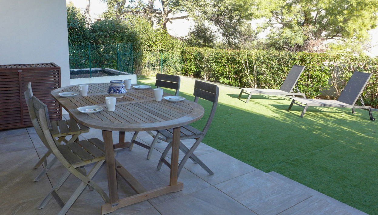 3-room apartment 55 m2, on the ground floor, south-east facing position. Beautiful and modern furnishings: living/dining room with panoramic window with TV (flat screen), air conditioning and electric shutters. Exit to the garden, to the terrace. 1 room with 1 french bed (1 x 140 cm, length 190 cm), TV (flat screen), air conditioning. Exit to the garden, to the terrace. 1 room with 1 french bed (1 x 140 cm, length 190 cm), air conditioning. Exit to the garden, to the terrace. Open kitchen (oven, dishwasher, 3 induction hot plates, toaster, kettle, microwave, freezer, electric coffee machine, Capsules for coffee machine (Nespresso) extra). Shower, sep. WC. Heating. Terrace 15 m2, roofed, garden 73 m2. Terrace furniture, deck chairs (2). View of the garden. Facilities: washing machine, iron, hair dryer. Parking space n 15 (1 car). Please note: suitable for families. Non-smokers only. TV only FR. Smoke alarm. FJS1151HT@