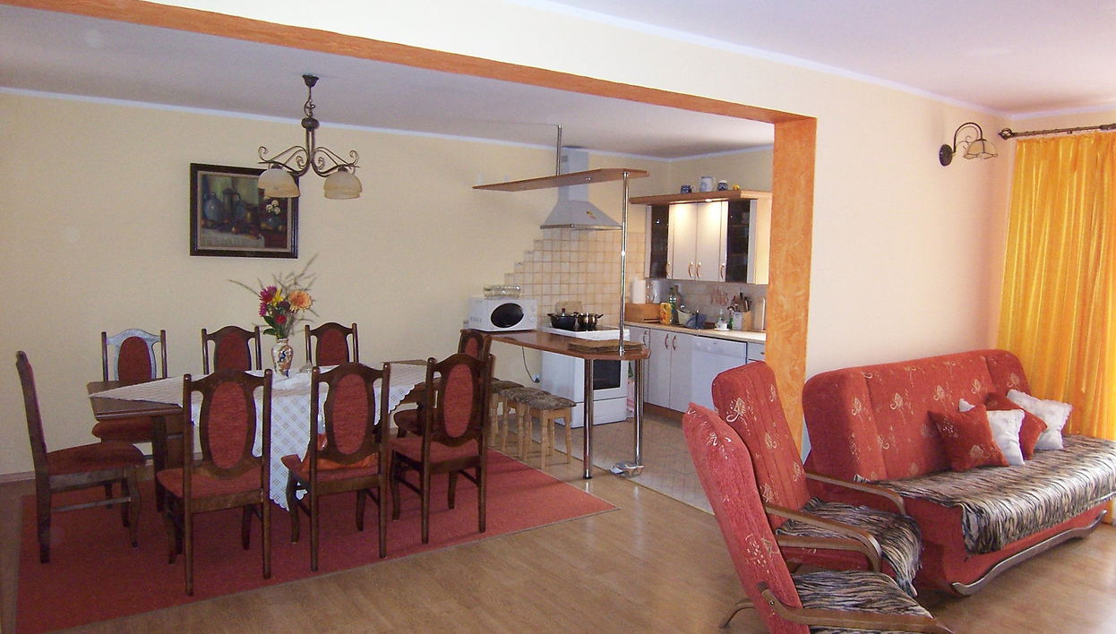 Mielno 13 km from Grunwald: Single-family house "Mielno 2". 50 m from the lake, 250 m from the beach, in the countryside. Private: property 900 m2 (fenced), garden. Garden furniture, barbecue, children's playground (sandbox). In the house: sauna, washing machine, heating to be paid on the spot, bicycles available (extra). Available: boat. Parking at the house, single garage. Shop 500 m, bar, café 50 m, bus stop 150 m. Cycle lane 300 m. Lake with sandy and grassy beach 100 m. Playground for football and volleyball 100 m. 4 bikes. Beautiful forest areas. Every year, from July 10 to July 15, a great staging of the Battle of Grunwald takes place, 13 km. The PL1411.100.1 facility is located 200 m from the Mielno 2 house (PL1411.102.1).