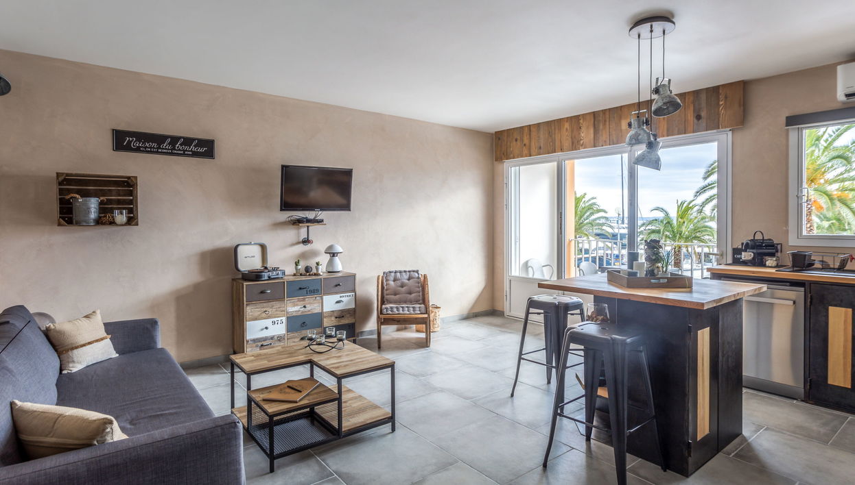 1-room apartment 36 m2 on 1st floor. Renovated in 2020, beautiful and modern furnishings: sleeping alcove with 1 french bed (140 cm, length 190 cm). Kitchen-/living room (oven, dishwasher, 2 induction hot plates, kettle, microwave, freezer, electric coffee machine, Capsules for coffee machine (Expresso) extra) with TV (flat screen). Exit to the balcony. Shower/WC. Electric heating, air-conditioning. Balcony 7 m2. Balcony furniture. Very beautiful view of the port. Facilities: washing machine, iron, hair dryer. Internet (WiFi, free). Please note: TV only FR. Smoke alarm. Instead of an enclosed bedroom, some sleeping areas are located in an open-plan area (gallery, alcove, etc.).