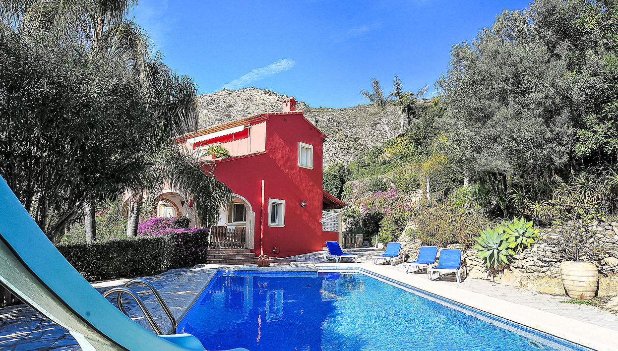 Beautiful villa "Aviles", 2 storeys. In the district of Castellans, in a quiet, sunny position, 9 km from the sea, in a cul-de-sac. Private: beautiful, well-kept garden 1'800 m2 (fenced) with lawn and wildlife garden, swimming pool with privacy, fenced (4 x 9 m, seasonal availability: 01.Jan. - 31.Dec.) with internal staircase. Slide. Stepped path (23 steps) to the house. Supermarket 2 km, restaurant 1 km, bus stop "Estacion de autobuses Javea" 2 km, sandy beach "Arenal" 9 km. Groups of teenagers on request only.