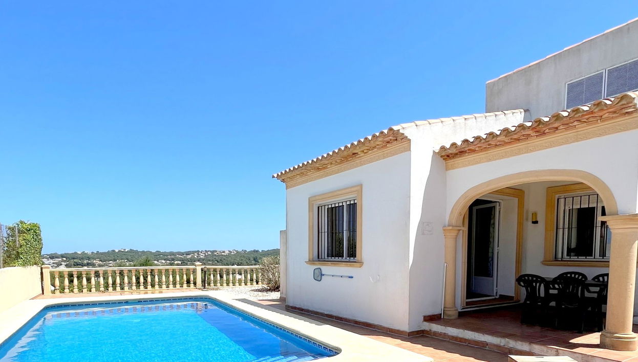 House. 24 houses in the residence. In the district of Monte Javea 5 km from the centre of Jávea-Arenal, on a slope, 3 km from the sea. Private: property (fenced) with wildlife garden and trees, swimming pool (8 x 4 m, depth 120 - 220 cm, seasonal availability: 01.Jan. - 31.Dec.). Public parking on the road. Shop 2.5 km, restaurant 1 km, bus stop "Calablanca" 3.6 km, sandy beach "Arenal" 5 km pebble beach "Granadella" 3 km. Tennis 1 km.