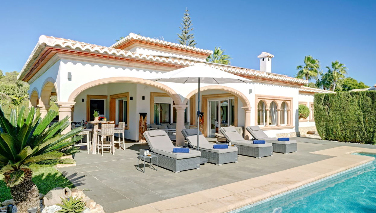 Very large, very beautiful, very comfortable villa "SanMar". In the district of Guardia Park, in the resort Jávea, in a quiet, sunny position, 1.4 km from the sea, 4.7 km from the beach. Private: large, beautiful, well-kept garden, swimming pool angular (9 x 5 m, depth 40 - 200 cm, seasonal availability: 01.Jan. - 31.Dec.) with internal staircase. Outdoor shower, pergola, garden furniture, barbecue, parking on the premises. Supermarket 3.4 km, restaurant 500 m, café 1 km, bus stop "Parada Toscamar" 3.3 km, sandy beach "El Arenal" 5 km, rocky beach "Cala Blanca" 4.6 km. Sports harbour 5.5 km, surf school 5 km, sailing school 5 km, tennis 750 m. The owner does not accept any youth groups.