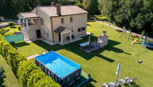 2-family house "Paola". 17 km from the centre of Rabac, in a sunny position, 6 km from the sea, on a main road. Private: property 500 m2, beautiful garden with lawn and wildlife garden, swimming pool (above ground) angular (5 x 2 m, 14 m2, depth 120 cm, seasonal availability: 01.Jun. - 14.Sep.). Outdoor shower, terrace (12 m2), garden furniture, barbecue, children's playground (slide, swing, sandbox). In the house: internet access, trampoline. Parking on the premises. Shop 1 km, supermarket 8 km, restaurant 1 km, bus stop 3.8 km, pebble beach 6 km, rocky beach 6 km. Sailing school 17 km, tennis 12 km, walking paths from the house 500 m, cycle lane 550 m.
