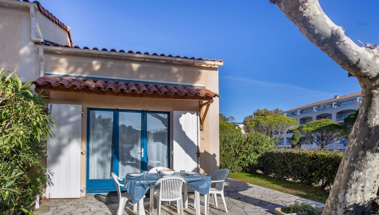 3-room terraced house 33 m2. Simple and beautiful furnishings: living/dining room with TV. Exit to the terrace. 1 room with 2 beds (80 cm, length 190 cm). Kitchenette (2 hot plates, oven, toaster, kettle, microwave, electric coffee machine). Bath/WC. Electric heating. Upper floor: (steep stair), 1 small room with 1 french bed (140 cm, length 190 cm). Terrace 40 m2, south-west facing position. Terrace furniture. Facilities: washing machine. Internet (WiFi, extra). Please note: apartment street side. No parking. Maximum 1 pet/ dog allowed. TV only FR. Smoke alarm. 83070002919TQ