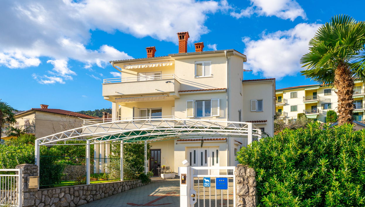 2-family house "JF Rezine". 400 m from the centre of Lovran, in a sunny, elevated position, 470 m from the sea, 550 m from the beach, in a cul-de-sac. For shared use: property 750 m2 with plants. Private: lawn 60 m2. In the house: internet access. Roofed, parking at the house on the premises. Supermarket 350 m, restaurant, café 400 m, bus stop 700 m, pebble beach 550 m, public bathing area 1.2 km. Walking paths from the house 500 m.