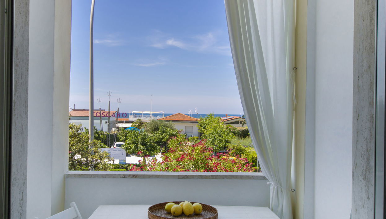 In a truly unique environment, the house is ideal for an all-sea holiday with a large terrace facing the sea. Comfortable 3-family house "Sandra". In the centre of Marina di Pietrasanta, in a sunny position, 50 m from the sea, 50 m from the beach. Heating available only from 01.Nov. - 15.Apr.. Linen change (suppl. charge extra). Towel change (suppl. charge extra). Parking (limited number of spaces) on the premises. Shop, grocery 300 m, supermarket 1 km, restaurant, bar 300 m, pedestrian zone 1 km, bicycle rental 200 m, 10 minute walk to the centre, bus stop 30 m, railway station "Pietrasanta" 5 km, sandy beach 50 m. Surf school 500 m, sailing school. Nearby attractions: Forte dei Marmi 4 km, Pisa 30 km, Lucca 20 km, Viareggio 12 km, Cinque Terre 50 km, Firenze 90 km. Hiking paths: Alpi Apuane 10 m. Please note: suitable for families, baby equipment on request (extra).