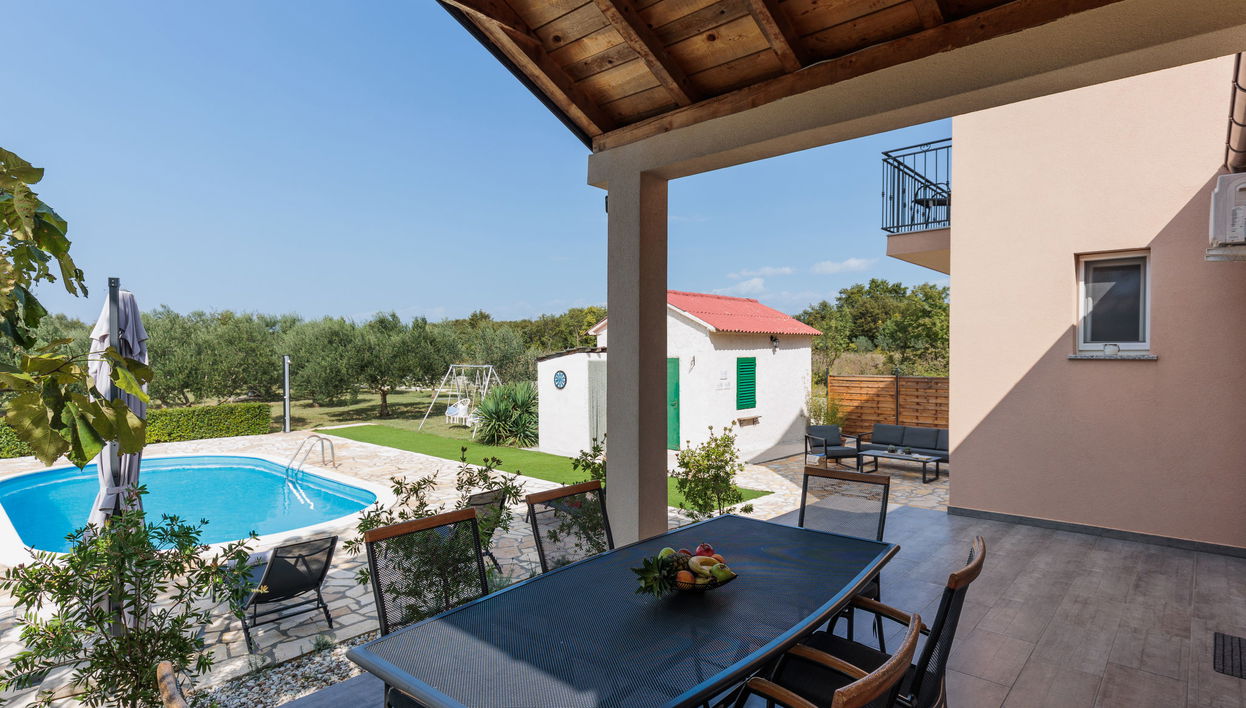 Poličnik 12 km from Zadar: Beautiful single-family house "Josipa", 2 storeys. In a quiet, sunny position, 13 km from the sea. For shared use: property 2'000 m2 (fenced), trees. Private: swimming pool round (8 x 4 m, depth 150 cm, seasonal availability: 01.Apr. - 01.Oct.) with internal staircase. Outdoor shower, garden furniture, barbecue. In the house: internet access, washing machine. Shop 800 m, restaurant 12 km, bus stop 750 m, sandy beach 11 km pebble beach 13 km. Tennis 13 km. The owner does not accept any youth groups. Please note: airfield 10 km from the property.