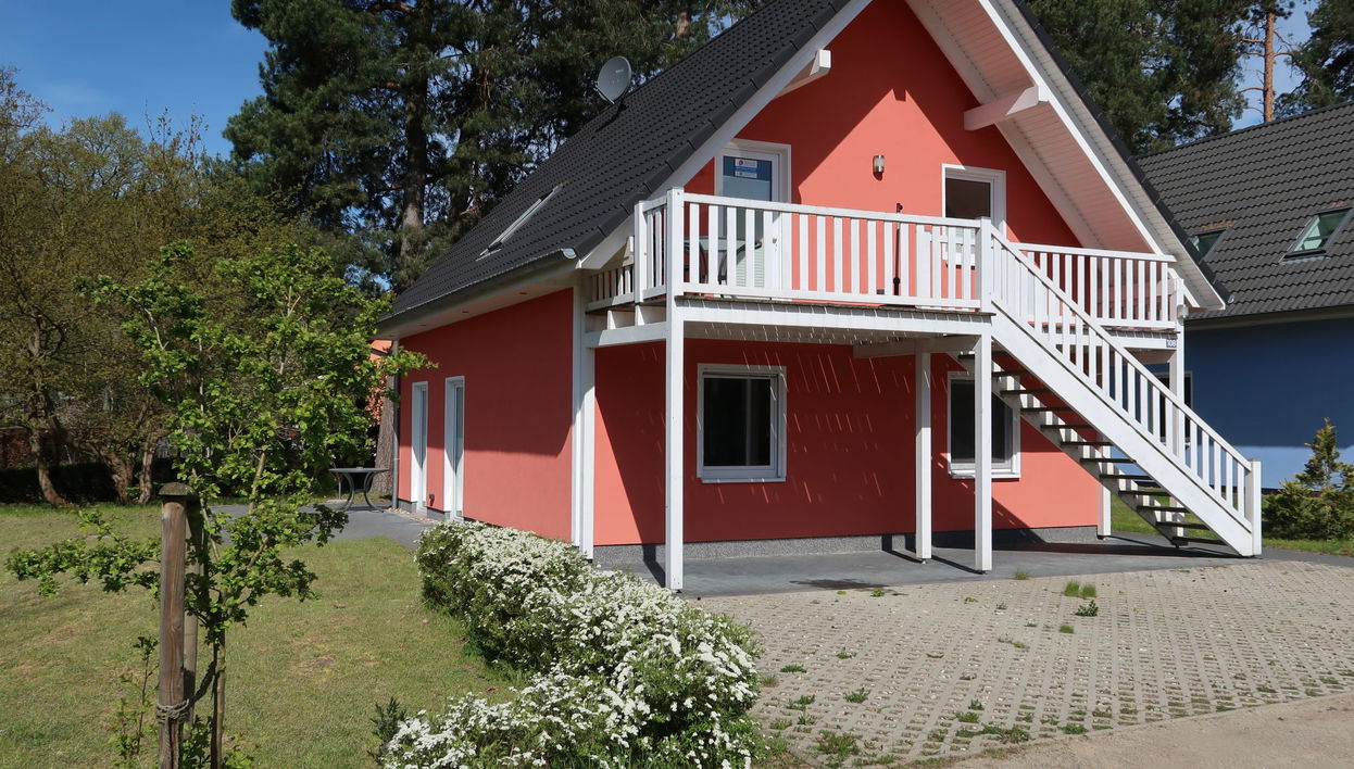 Holiday village "Müritz Ferienpark Röbel", surrounded by trees. 100 houses in the resort. 2 km from the centre of Röbel, on the outskirts, 15 km from the centre of Klink, 20 km from the centre of Waren, 250 m from the lake, in the countryside. In the complex: reception. E-charging station. Supermarket 2 km, restaurant 150 m, bus stop "Unter den Kiefern" 50 m, grass beach 350 m, indoor swimming pool 2 km. Marina 1.5 km, golf course (18 hole) 15 km, tennis 15 km. Nearby attractions: Müritznationalpark 25 km. The owner does not accept any youth groups. The houses are located 100-350 m from the beach, depending on the location.