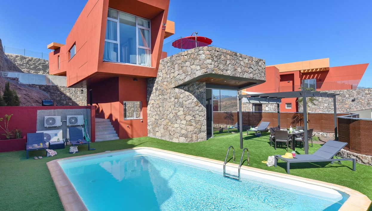 Cosy, comfortable villa "Villa Green 8". In the centre of Salobre Golf Resort, in a secluded, quiet, sunny position. Private: garden (fenced) with lawn, swimming pool angular (7 x 3 m, depth 160 - 170 cm, seasonal availability: 01.Jan. - 31.Dec.). In the house: sun terrace, air conditioning. Parking on the premises, public parking on the road. Bus stop "Las Crucitas" 19 km. The owner does not accept any youth groups. Neighbourhood highly sensitive to noise. Quietness and good behaviour expected.