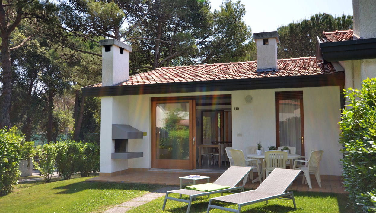 Resort "Club dei Pini". 33 houses in the resort. In the district of Lido dei Pini 150 m from the centre of Bibione - Lido dei Pini, 13 km from the centre of Lignano, 100 km from the centre of Venezia, 500 m from the sea. For shared use: property, well-kept garden lawn and trees, swimming pool (15 x 8 m, seasonal availability: 15.May. - 27.Sep.). Children's pool. In the house: bicycle rental. Shop, restaurant 150 m, bus stop 650 m, railway station "Latisana (Venezia-Trieste)" 21 km, sandy beach 500 m. Golf course (18 hole) 8 km. Nearby attractions: Oasi Naturalistica Val Grande - Bibione. The owner does not accept any groups. Beach service: During summer season 1 parasol and 2 deck-chairs per apartment included in the price.