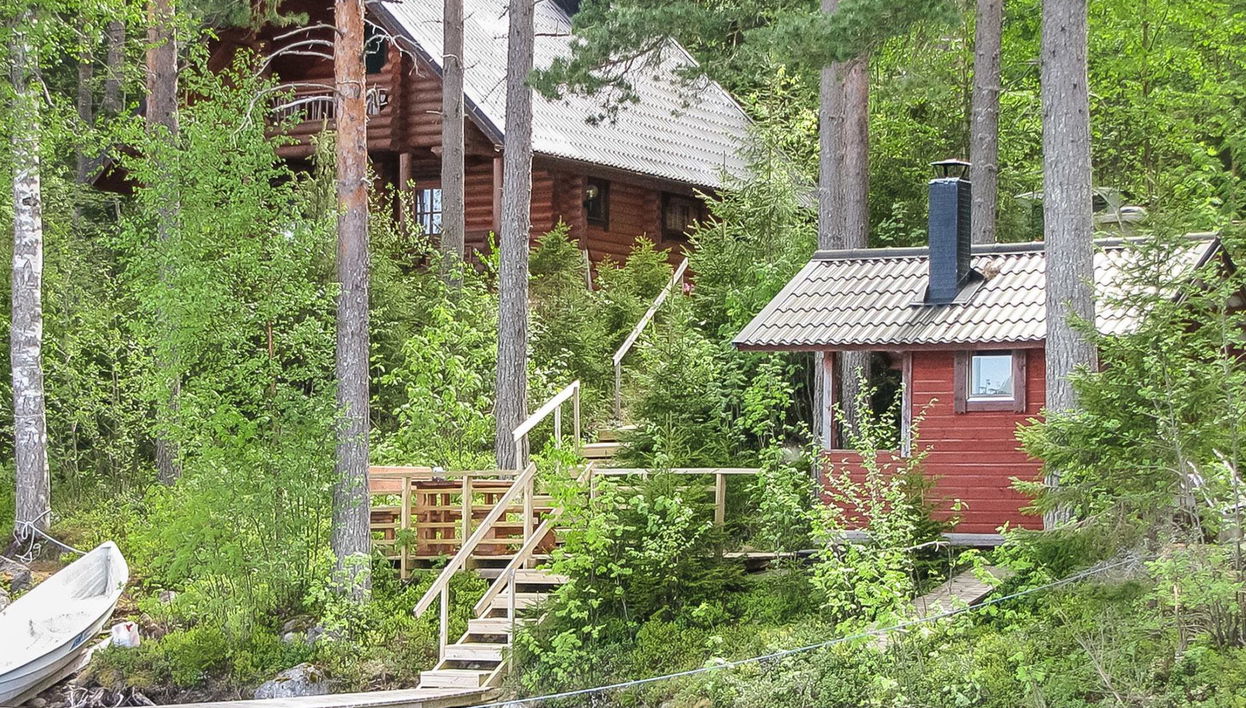 56 km south of Savonlinna. Lake Saimaa 25 m, shallow water, firm gravel bottom. Own boat. Log cabin 199, kitchen, living room with 1 extra bed (convertible sofa), washroom, sauna (electric sauna stove), open veranda. Upstairs: bedrooms with 2 beds, vestibul 2 beds, balcony (steep stairs to upstairs). Lakeside sauna.