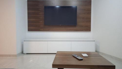 The spacious apartment includes 2 bedrooms and a living room with a flat-screen TV.