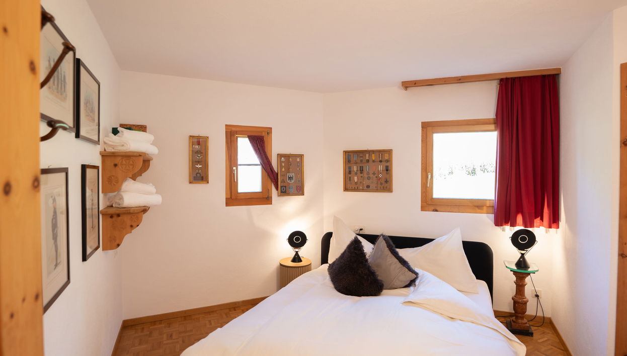 "Chesa Cresta", 3-room apartment 65 m2, on the upper ground floor. Object suitable for 2 adults + 2 children. Bright, tasteful and cosy furnishings: living/dining room with TV (flat screen). Exit to the terrace, south-west facing position. 1 room with 1 double bed (1 x 170 cm, length 200 cm). 1 small children's room with 1 x 2 bunk beds (90 cm, length 190 cm). Small kitchen (4 hot plates, oven, dishwasher, toaster, kettle, microwave, electric coffee machine, Capsules for coffee machine (Nespresso) extra, raclette grill). Bath/WC, bidet, sep. WC. Heating. Wooden floors. Terrace. Terrace furniture, deck chairs (2). Very beautiful view of the mountains and the ski run. Facilities: hair dryer. Internet (WiFi, free). Garage space n 6 + 10 on the property (2 cars), height 230 cm, width 295 cm. Please note: non-smokers only. Maximum 1 pet/ dog allowed. No lift.