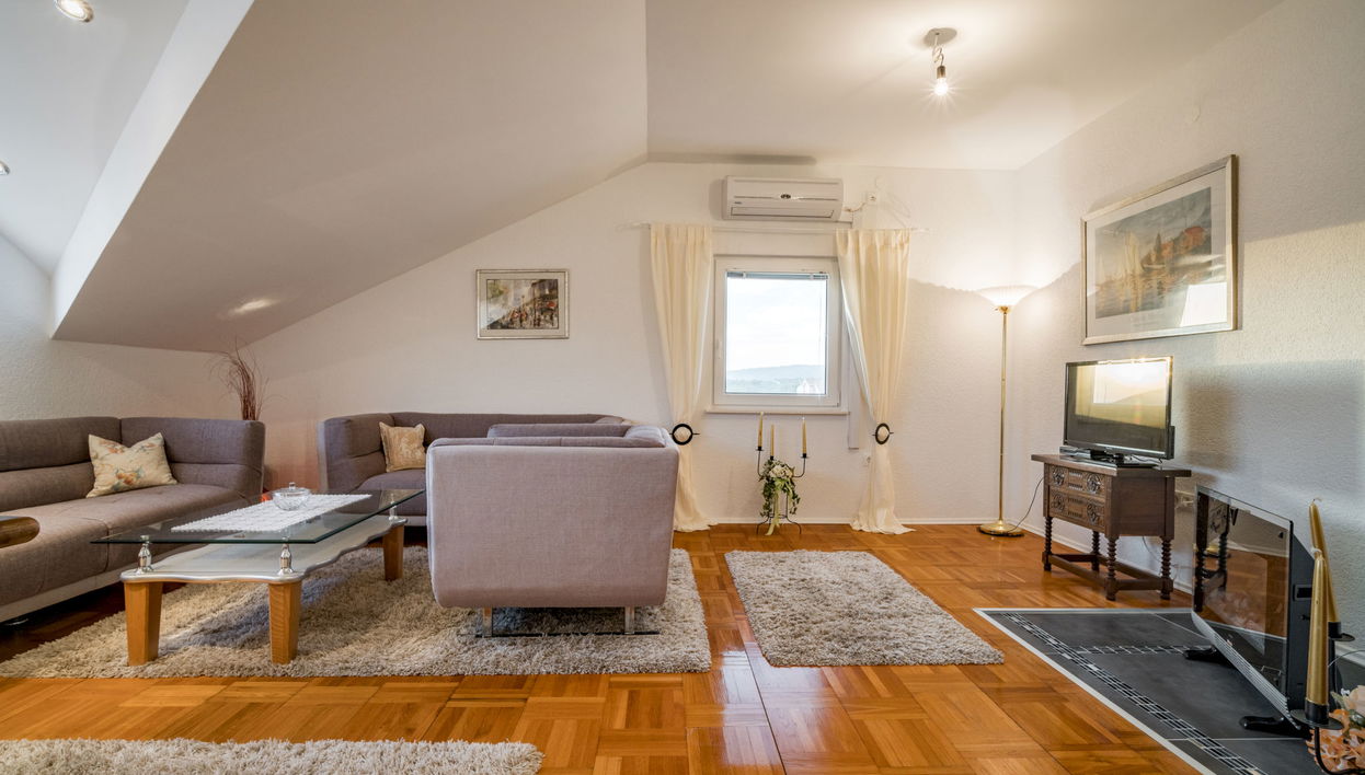4-room apartment 135 m2, on the top floor, south-west facing position. Living/dining room 40 m2, with sloping ceilings, ceiling height 120 - 250 cm with satellite TV (flat screen), air conditioning.