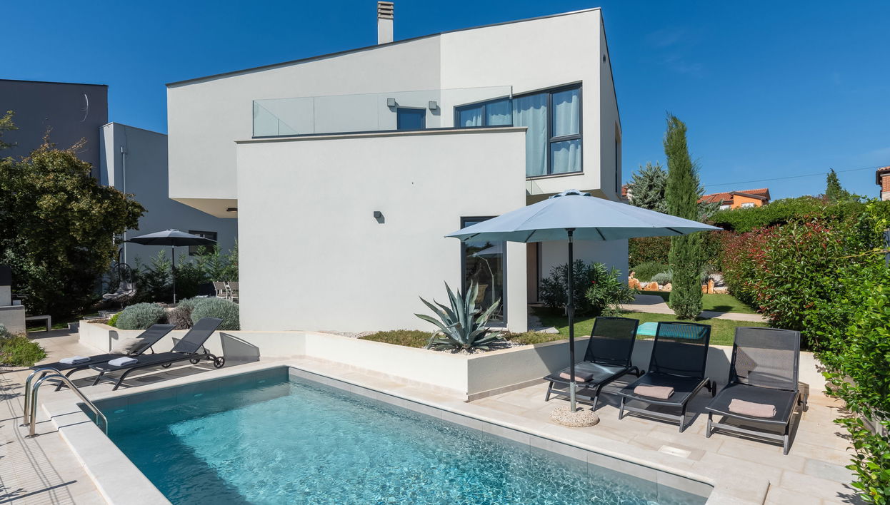 Tar 7 km from Poreč: Modern villa "Marko Aurelia", 2 storeys. In the hamlet Vabriga 1 km from the centre of Tar, in a sunny position, 2 km from the sea, 2 km from the beach. Private: property 550 m2 (fenced), lawn, swimming pool angular (6 x 4 m, depth 150 cm, seasonal availability: 01.May. - 30.Sep.) with salt-electrolysis pool-cleaning system. Outdoor shower, garden furniture, barbecue. In the house: internet access, washing machine. Parking (for 2 cars) at the house on the premises. E-charging station. Shop 800 m, restaurant 300 m, bus stop 1.2 km, pebble beach 2 km, rocky beach 2 km. Walking paths from the house 100 m, cycle lane 150 m. Nearby attractions: Aquapark 14 km. The owner does not accept any youth groups. Electric vehicle charging station (domestic socket, on request and extra).
