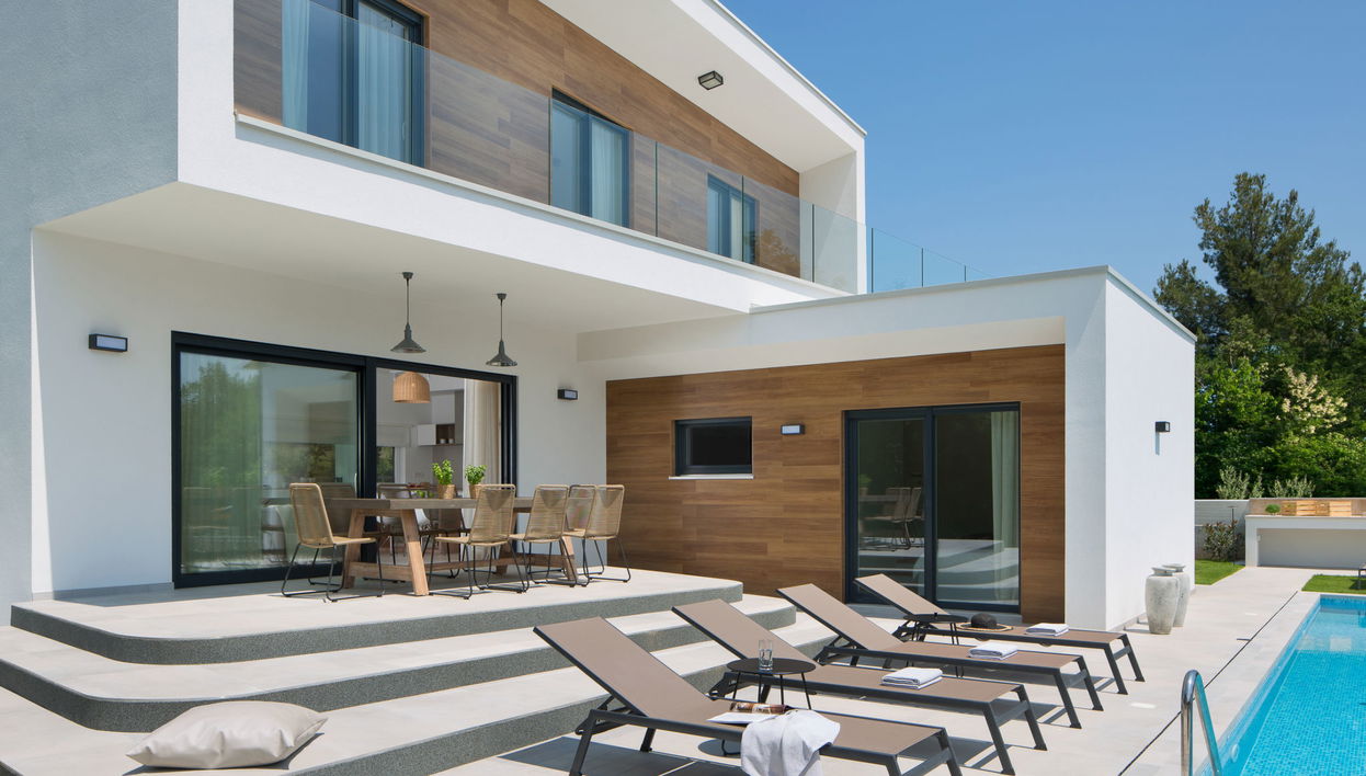 Tar 7 km from Poreč: Modern villa "Santa Marina", 2 storeys. In the hamlet Vabriga 1 km from the centre of Tar, in a sunny position, 2 km from the sea, 2 km from the beach. Private: property 650 m2 (fenced), beautiful garden with lawn, swimming pool angular (14 x 3 m, depth 140 cm, seasonal availability: 01.Apr. - 30.Oct.) with internal staircase. Outdoor shower, hot tub, barbecue. In the house: internet access, washing machine. Motor access to the house (300 m via unmade road). Parking (for 2 cars) at the house on the premises. Shop 500 m, restaurant 200 m, bus stop 8 km, railway station 38 km, pebble beach 2 km, rocky beach 2 km. Walking paths from the house 100 m, cycle lane 150 m. The owner does not accept any youth groups.