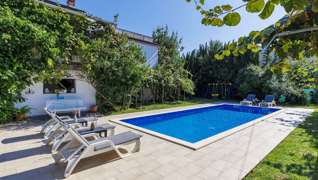 Beautiful single-family house "Villa Toni", 2 storeys. 500 m from the centre of Umag, in a quiet, sunny position, 800 m from the sea, from the beach. Private: property 1'200 m2 (fenced), beautiful garden with lawn and wildlife garden, swimming pool angular (10 x 4 m, depth 140 cm, seasonal availability: 27.Apr. - 12.Oct.) with internal staircase and salt-electrolysis pool-cleaning system. WC in the pool area, outdoor shower, terrace (30 m2), garden furniture, barbecue. In the house: internet access, table tennis, storage room for bicycles, washing machine. Parking (for 3 cars) at the house on the premises. Shop, restaurant 200 m, bus stop 1.4 km, sandy beach, pebble beach 800 m. Golf course (18 hole) 10 km, tennis 1 km, walking paths from the house 100 m, cycle lane 150 m. The owner does not accept any youth groups. Neighbourhood highly sensitive to noise. Quietness and good behaviour expected. Ground floor is closed and not occupied. Outdoor kitchen (4 ceramic glass hob hotplates). Organizing a party is not allowed.
