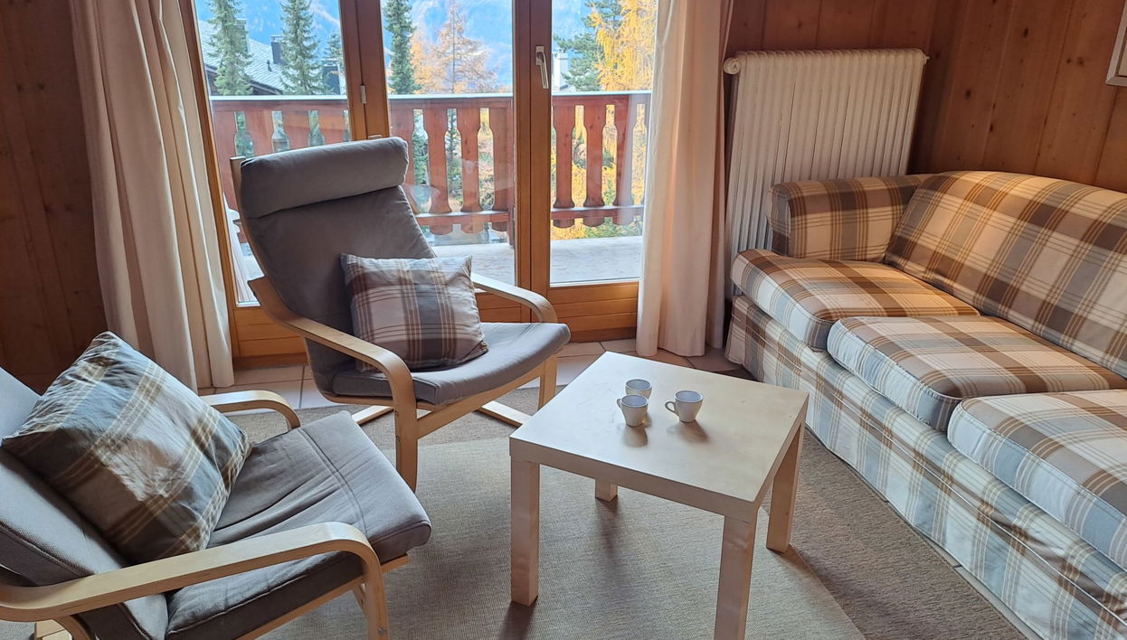 "Arvine combles", 3-room penthouse 60 m2 on 2nd floor. Bright, simple and comfortable furnishings: open living/dining room with dining nook, TV and heating stove. Exit to the balcony. 1 room with 1 double bed (2 x 90 cm, length 200 cm). Exit to the balcony. 1 room with 1 double bed (2 x 90 cm, length 200 cm). Small, open kitchen (4 hot plates, oven, toaster, kettle, microwave, freezer, electric coffee machine, Capsules for coffee machine (König (Migros)) extra, raclette grill, fondue Set (cheese)) with bar. Sep. WC, bath or shower. Oil heating. Large balcony. Balcony furniture. Very beautiful view of the mountains, the countryside and the resort. Facilities: hair dryer. Internet (WiFi, free). Garage space n Privé (1 car) at 50 m. Please note: non-smokers only. Maximum 1 pet/ dog allowed. No lift.