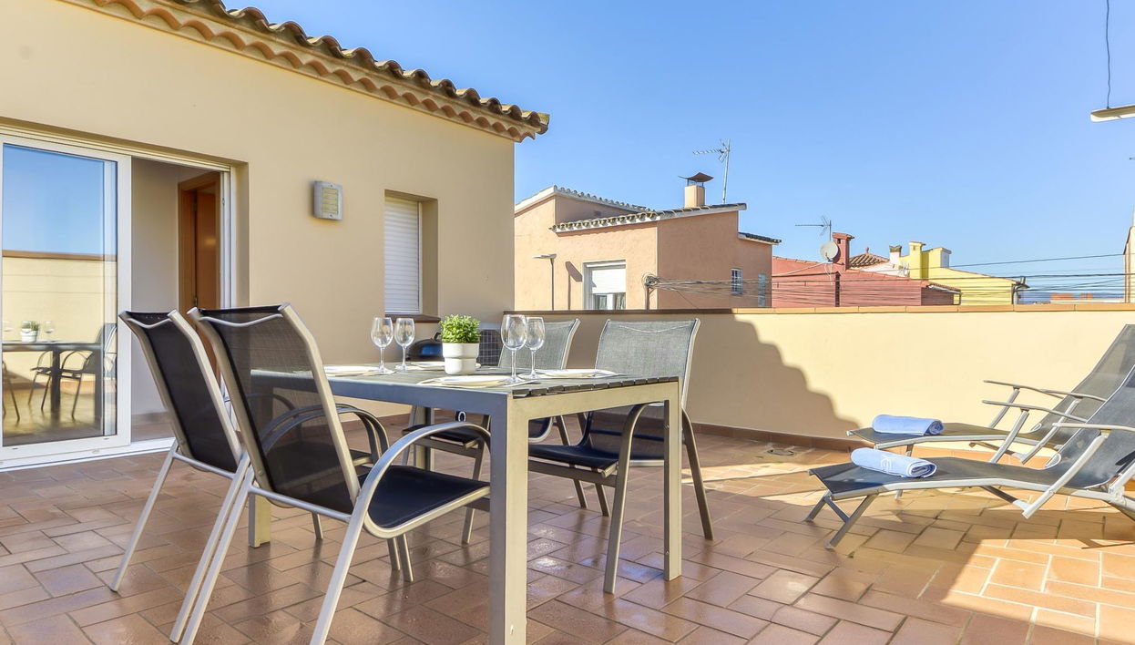 Maison mitoyenne 3 pièces 60 m2. Spacieux et clair, aménagement confortable et moderne: à l'étage supérieur: séjour/salle à manger avec 1 lit, Télévision numérique, écran plat, air-conditionné et chauffage à air chaud. 1 chambre avec 1 grand-lit. 1 chambre avec 1 lit (90 cm). Cuisine ouverte (four, lave-vaisselle, 3 plaques vitrocéramiques, micro-ondes). Douche/WC. Terrasse 35 m2. Meubles de terrasse. A disposition: lave-linge. Internet (Connexion WIFI, gratuit). Place de parking (cloturée). Veuillez noter: maximum 1 animal/ chien autorisé. TV seulement ES. HUTG010846 // Reg. Nr.: ESFCTU000017020000124148000000000000000000HUTG0108469