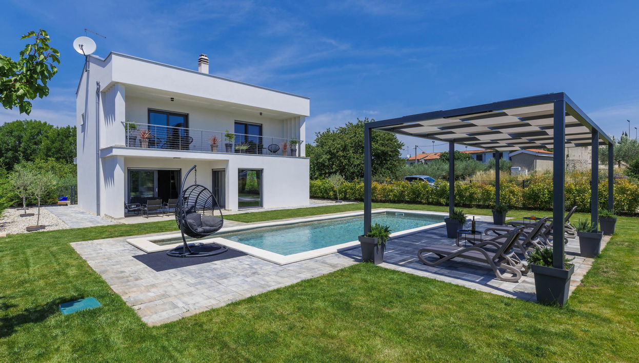 Maison individuelle moderne "Villa Essea", de 2 étages, année de construction 2022. À 500 m du centre de Kanfanar, à 15 km du centre de Rovinj, situation ensoleillée, à 13 km de la mer. A usage privé: terrain 700 m2, jardin avec pelouse et plantes, piscine rectangulaire, chauffée (9 x 4 m, profondeur 150 cm, disponibilité saisonnière: 01.Jan. - 31.Dec.) avec marches intérieures. Tonnelle. Infrastructures de la Maison: accès internet, lave-linge. Place de parking (pour 2 voitures) près de la maison sur le terrain. Magasins 1 km, restaurant 1.5 km, arrêt de bus 500 m, plage de graviers 20 km. Chemins de randonnées pédestres depuis la maison 100 m, piste cyclable 150 m. Attractions à proximité: Lim Bay 13 km. Veuillez noter: adapté(e) aux familles. Le propriétaire n'accepte pas les groupes de jeunes.