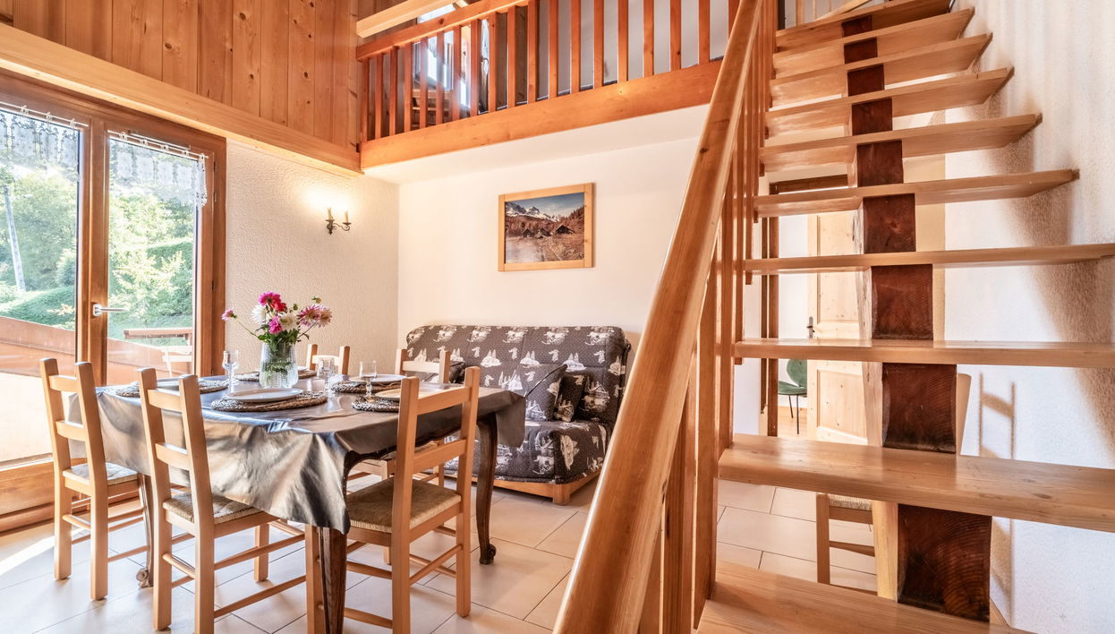 "Le Tetras", apt 2 pièces 50 m2 sur 2 niveaux, situation sud. Aménagement fonctionnel et rustique: séjour/salle à manger avec table pour les repas et TV. 1 chambre avec 1 grand-lit (140 cm).