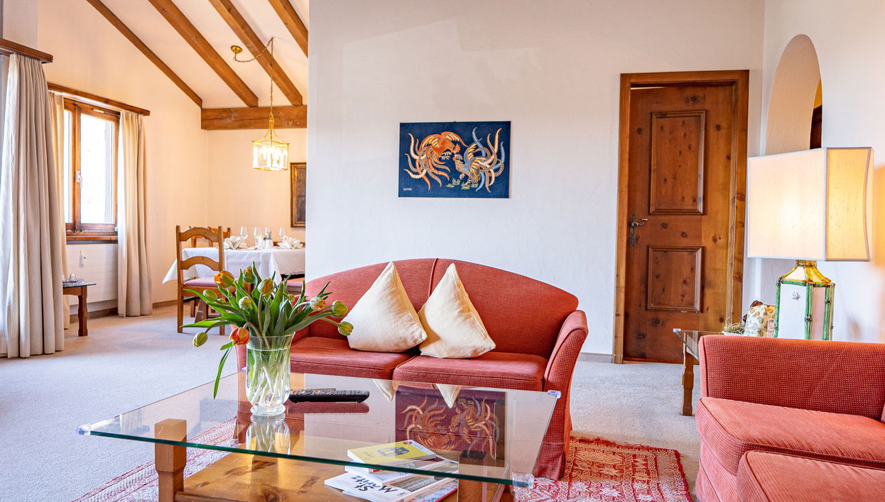 "Chesa La Sajetta 12", apt 4 pièces 100 m2, sous le toit. Séjour/salle à manger avec cheminée (uniquement à titre de décoration), TV, chaîne stéréo et DVD. Sortie sur le balcon, orientée ouest. 1 chambre avec 2 lits (100 cm, longueur 195 cm).