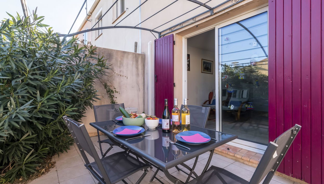 "L'Abrivado", casa a schiera 3 locali 50 m2. Oggetto adatto a 2 adulti + 2 bambini. Soggiorno/sala da pranzo con TV (schermo piatto), riscaldamento elettrico e climatizzazione. Uscita sulla terrazza.