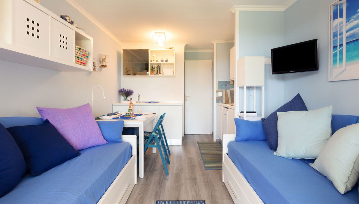 "L'Esquinade (F6 019)", apt. di 2 locali 28 m2, al pianterreno. Soggiorno con 1 letto estraibile (2 x 80 cm, lunghezza 190 cm), TV (schermo piatto). Uscita sulla terrazza. 1 camera con 1 letto alla francese (160 cm, lunghezza 200 cm).