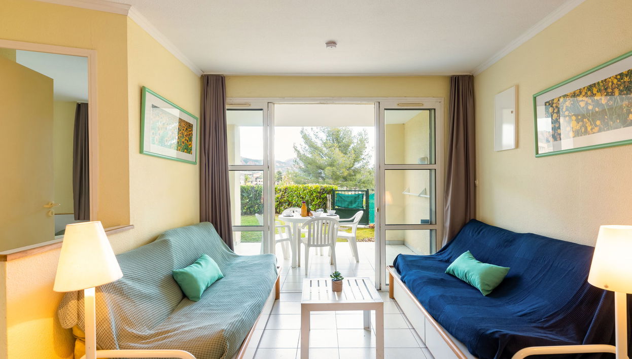 "L'Esquinade (FH 012)", apt. di 2 locali 28 m2, piano rialzato. Soggiorno/camera con 1 letto estraibile (2 x 80 cm, lunghezza 190 cm), TV (schermo piatto). Uscita sulla terrazza, verso il patio.